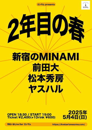 2025年5月4日(日) PM18:30開場 PM19:00開演 ロンサム(阿佐ヶ谷) 2400円(+1ドリンク・600円) 配信2000円(ロンサム ツイキャスアカウント) 【配信購入ページ】 https://twitcasting.tv/lonesome_live/shopcart/365257